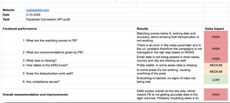- Report with clear insights, improvements, timelines and investments to get more sales